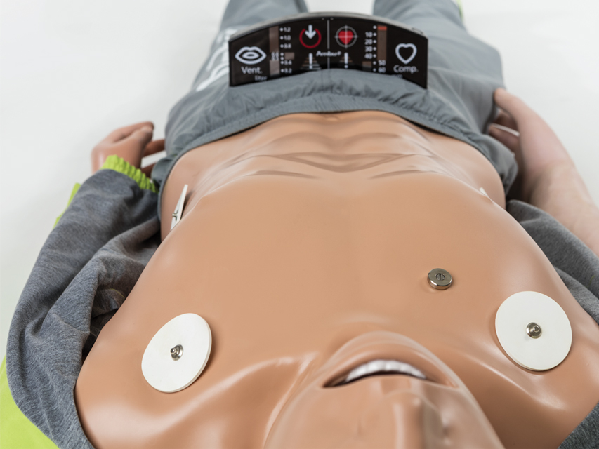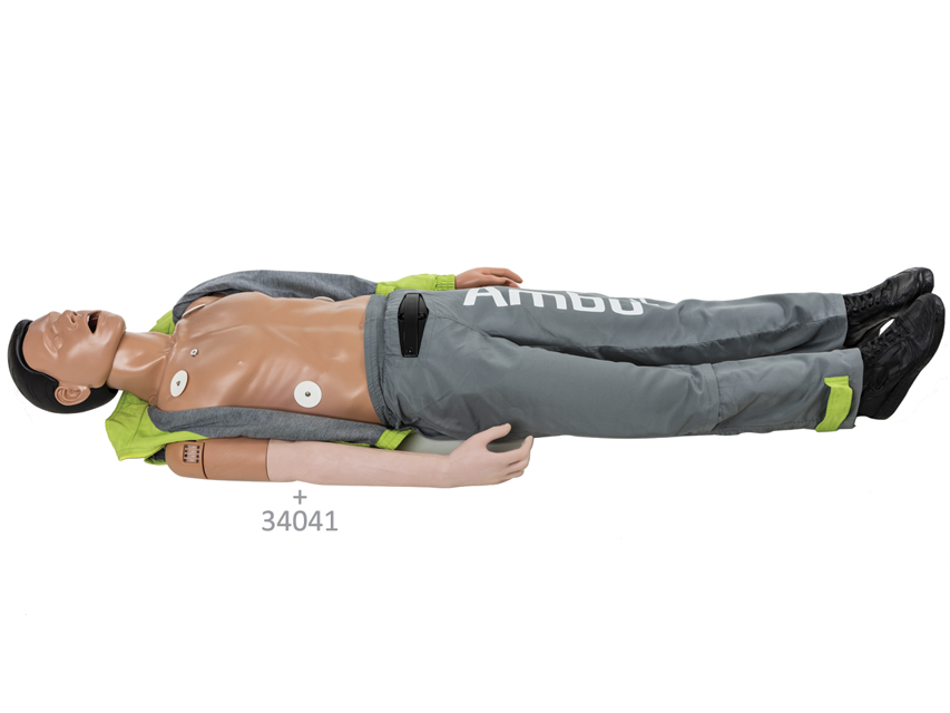 Profesionāls apmācības manekens, kas izstrādāts, lai apmierinātu visas uzlabotā dzīvības atbalsta (ALS) apmācības vajadzības. Manekena uzmanības centrā ir algoritms: elpceļu pārvaldība, EKG simulācija, defibrilācija un IV piekļuves tehnikas apmācība. Integrēta Ambu bezvadu tehnoloģija: pārlūkprogrammā bāzētais Ambu manekena pārvaldības modulis ļauj bezvadu režīmā vadīt, dokumentēt un uzraudzīt apmācāmā veiktspēju, izmantojot centrālo interfeisu, kur tiek apvienoti visi dati un informācija: saspiešanas dziļums, pareiza rokas pozīcija, ventilācijas apjoms, vēdera piepūšana. Pielāgota scenāriju apmācība: intuitīvais lietotāja interfeiss ļauj ātri un viegli izveidot pielāgotus scenārijus un pielāgot tos dažādām kursu koncepcijām atbilstoši instruktoru prasībām un pašreizējām ERC / AHA vadlīnijām. CPR parametri un manuālie notikumi tiek dokumentēti bezvadu režīmā un iekļauti novērtēšanā un pārskatā. Individuālais praktikantu vērtējums grupā: efektīvāka apmācība, katrs dalībnieks saņem savus personīgos rezultātus (līdz četriem dalībniekiem). Tehniskās specifikācijas. Ventilācija no mutes mutē: NAV. Ventilācija no mutes uz degunu: NAV. Ventilācija ar maisu-vārstu-masku: JĀ. Guedel elpceļa izmantošana: JĀ. Elpceļu vadība: ET caurule, balsenes caurule un maska un citi SGA: JĀ. Žokļa vilces manevrs: JĀ. Kuņģa insuflācija: JĀ. Ambu higiēnas sistēma: NAV. Krūškurvja saspiešana: JĀ. Maksimālais saspiešanas dziļums: 7 cm. Maksimālā insuflācija: 1,2 litri. Rokas stāvokļa displejs: JĀ. Bezpakāpju regulējams krūškurvja stīvums: JĀ. Impulss: elektrisks. Defibrilācijas elektrodu novietojums: JĀ. Defibrilācija: JĀ. I.V. piekļuve (nepieciešams IV trenažieris 34041): izvēles. Bezvadu CPR programmatūra: JĀ. EKG displejs: JĀ. AMBU maiss: JĀ. Svars: 13,3 kg.