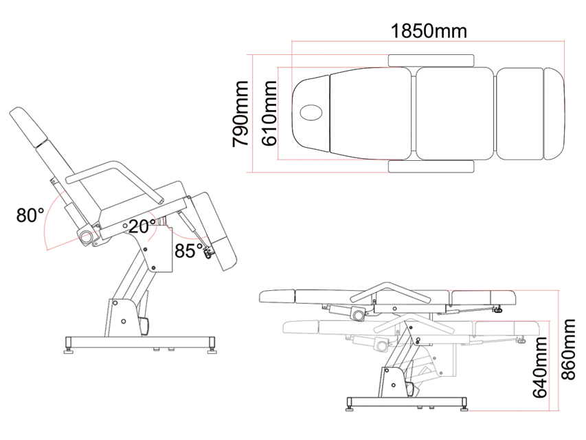 AMIRA krēsls. 2 motori. Balts. Elektriski vadāms krēsls, lai atsevišķi regulētu augstumu un atzveltni. Manuāla sēdekļa slīpuma leņķa un kāju balsta regulēšana. Komplektā ar spilvenu. Sejas atvere aiz spilvena. Izmērs: 185 x 69 xh 64-86 cm. Neto svars: 62 kg. Maksimālā slodze: 175 kg. Darbības jauda: 100-240 V. 50/60 Hz. Sēdekļa slīpuma leņķa regulēšana 20° (manuāla). Pēdu balsta leņķa regulēšana no 0° līdz 85° (manuāla). Pēdu balsta manuāla pagarināšana. Augstuma regulēšana 64-86 cm.