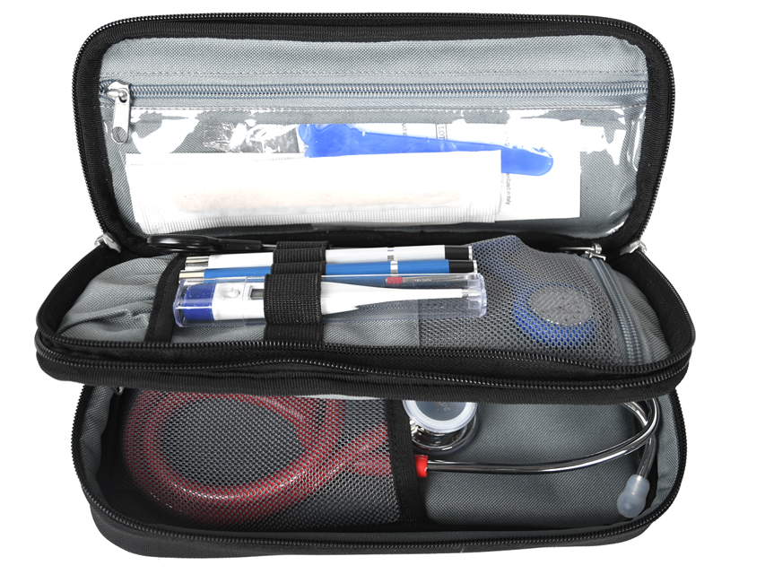 Daudzlietojuma mīkstā soma.Melns.Iekšējais ieliktnis sadala šo somu divos nodalījumos: vienu stetoskopam, vienu medmāsas piederumiem.Apakšējais nodalījums ar vienu elastīgu kabatu un vienu caurspīdīgu rāvējslēdzēja kabatu.Augšējais nodalījums ar 6 elastīgām cilpām, vienu caurspīdīgu rāvējslēdzēja kabatu un vienu tīkla kabatu.Dubults rāvējslēdzējs ērtai piekļuvei.Izmērs: 28x12,5x6,5 cm.Komplektā ar pārnēsāšanas rokturi.