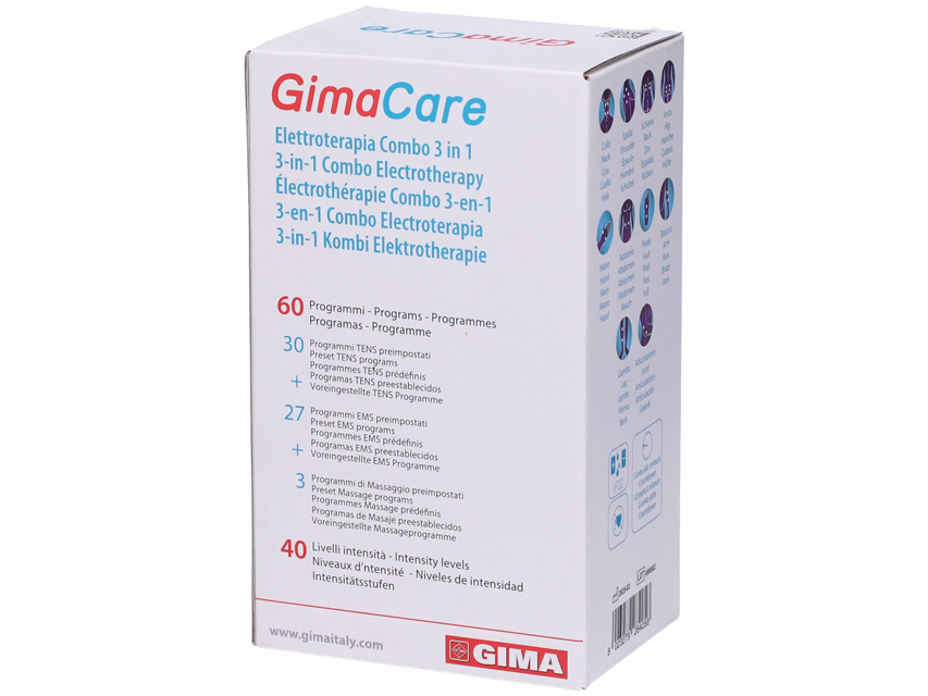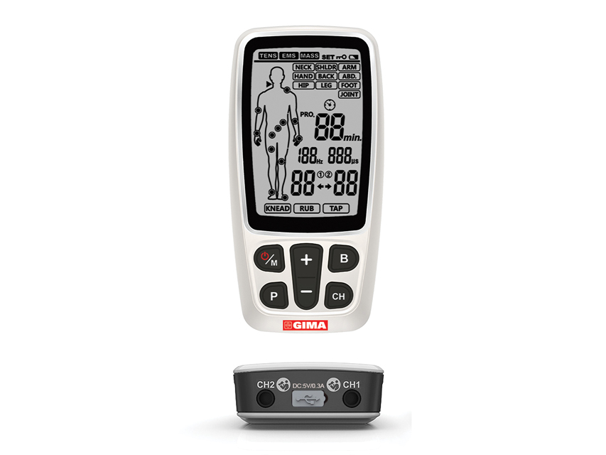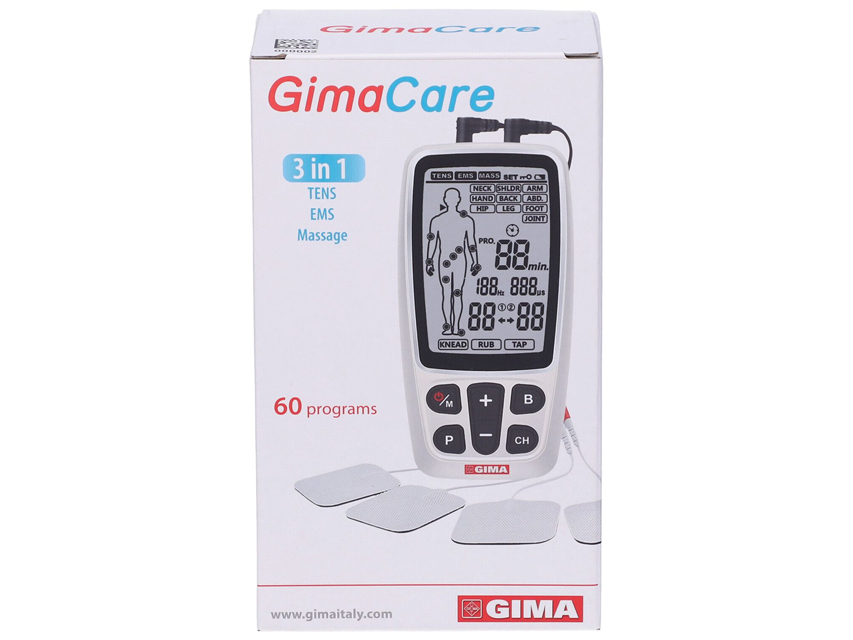 GIMA-CARE TENS - 60 medicīniskās programmas.Divu kanālu daudzfunkcionāla elektroterapijas ierīce, kas ģenerē elektrisko stimulāciju un palīdz mazināt sāpes, trenēt muskuļus un atslābināt.Viegli lietojams, GIMA-CARE ir 2 iepriekš iestatītas ārstēšanas programmas ar regulējamu ārstēšanas laiku un 1 pielāgota programma katrai ķermeņa daļai, kas ļauj lietotājam pielāgot ārstēšanas ilgumu, pulsa frekvenci un impulsa platumu.- 3 in 1 TENS + EMS + masāža.- profesionāla desmitu viļņu forma (mainīga impulsa frekvence un platums).- ķermeņa daļu ilustrācija.- 60 programmas (10 ķermeņa daļas, 40 līmeņi).- jaudīga izeja (maks. 120 mA) (pie 500 omu slodzes).- stabils un skaidrs dizains.Nepārtraukta darbība aptuveni 10 procedūrām, ja ierīce ir pilnībā uzlādēta.Komplektā ietilpst 4 spilventiņi 50x50 mm, 2 izvades kabeļi, 1 USB kabelis.Lietotāja rokasgrāmata (GB, FR, IT, ES, DE).Tehniskās specifikācijas.60 programmas - TENS/EMS/MASĀŽA.TENS (Transkutāna elektriskā nervu stimulācija).Ķermeņa daļas: kakls, pleci, roka, plauksta, mugura, vēders, gurni, kāja, pēda, locītava.Ārstēšanas programma: 30 programmas, 10 regulējamas programmas.EMS (elektriskā muskuļu stimulācija).Ķermeņa daļas: kakls, pleci, rokas, mugura, vēders, gurni, kāja, pēda.Ārstēšanas programma: 27 programmas, 9 regulējamas programmas.MASĀŽA.Metodes: mīcīšana, berzēšana, piesitiens.Ārstēšanas programma: 3 masāžas manipulācijas visām ķermeņa daļām.TEHNISKĀS SPECIFIKĀCIJAS.Kanāls: 2.Viļņu forma: divfāzu kvadrātveida impulss.Izejas strāva: maks. 120 mA (pie 500 omu slodzes).Izejas intensitāte: no 0 līdz 40 līmeņiem, regulējama.Barošana: 3,7 V Li-ion uzlādējamā baterija.Displejs: baltā aizmugurgaismojuma displejs.Izmēri - svars: 109x54,4x23 mm - 85 g.Klasifikācija: BF tipa pielietotā daļa, iekšējā barošanas iekārta, IP22.Normas: IEC60601, IEC61000-4-2, IEC61000-4-4, IEC61000-4-5, IEC61000-4-11, IEC61000-4-8, IEC61000-4-3.