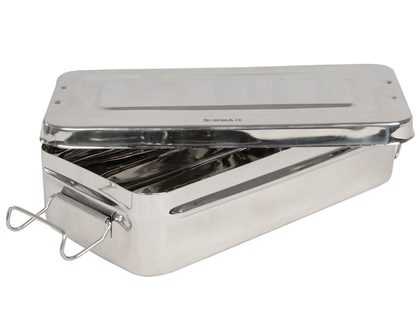 Nerūsējošā tērauda kastītei ir rokturi vieglai un drošai tās noslēgšanai.Ar rokturiem autoklavējama pie 125C.Bez rokturiem autoklavējama pie 100C.