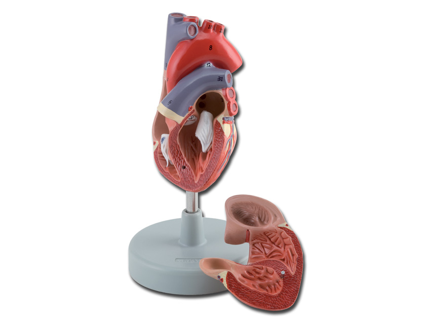 Dzīves izmērs 2 daļās. Sirds priekšējo sienu var noņemt, lai parādītu kreiso un labo kambara, ātriju, kā arī trikuspidālo, plaušu, mitrālo un aortas vārstuļus.