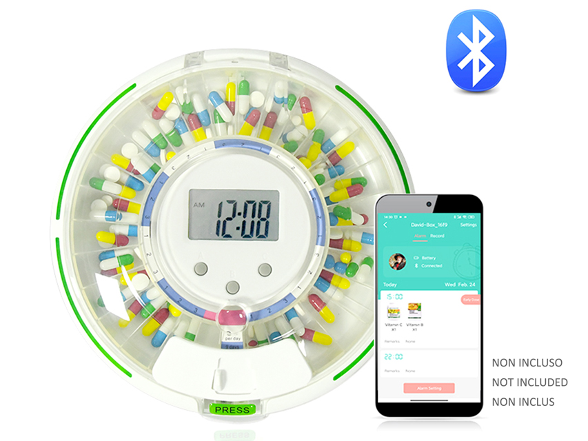 Bezvadu tablešu dozators.Automātiskais bezvadu tablešu dozators, lai pārvaldītu un reģistrētu tablešu devas datus ar Healbox lietotni un mākoņserveri.Tas ļauj pacientiem un aprūpētājiem ieprogrammēt devas līdz maksimāli 28 dienām pēc kārtas.Tas arī ļauj dot pareizo devu pareizajiem pacientiem pareizajā laikā.Ierīcei ir audio un vizuāli brīdinājumi līdz 9 trauksmes signāliem dienā, kas skan 30 minūtes vai līdz brīdim, kad dozators tiek apgriezts.Tas automātiski pagriežas, kad ir laiks nākamajai devai.Tam ir 28 nodalījumi ar 24 aspirīna izmēra tablešu ietilpību.Vāku var aizslēgt ar metāla atslēgu.Slimnīcām, sabiedriskajiem dienestiem vai personīgai lietošanai.Komplektā ietilpst 1 zāļu paliktnis, 1 dozēšanas gredzenu komplekts, 1 metāla atslēga, 4xAA baterijas un daudzvalodu instrukcijas (GB, FR, IT, ES, PT).Vienkārša iestatīšana — tikai trīs pogas laika/raidīšanas signāla/skaļuma iestatīšanai.Bumbuļveida gredzens ar vāciņu un bloķēšanas sistēmu aizsardzībai pret mitrumu.Iekļauta bloķēšanas atslēga drošam vāka nostiprinājumam.