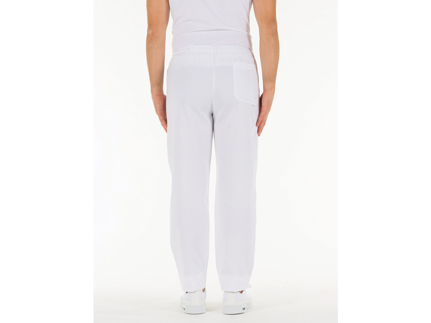2 priekšējās kabatas un 1 aizmugurē.Elastīga jostasvieta.Unisex N1.Bikses.Baltas kokvilnas.