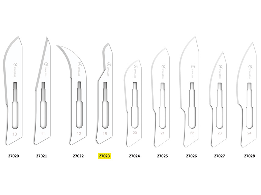 Ķirurģiskie S/S asmeņi ar apaļu aizsarguzgali. Izgatavoti saskaņā ar BS British 2982: 1992, BS 5194: 1992 standartu un ISO 7740: 1985 prasībām. Katram asmenim ir kvalitātes zīme, un tas ir individuāli iesaiņots alumīnija folijā. Asmeņa izmērs ir skaidri apzīmēts folijas otrā pusē un ar kodētām krāsainām uzlīmēm uz kārbām. Atbalsta FDA.N100.