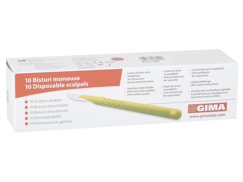 Vienreizlietojamie skalpeļi GIMA.Sterili.Modelis PREMIUM.S/S asmens iebūvēts rokturī no ABS plastikāta.Individuāli iepakoti sterilā aploksnē ar asmens drošības aizsargu.Izturīgs un ērts korpuss no ABS.Lieliski līdzsvaroti.Vairākslāņu asmens, Sonic metinājums.Neslīdošs asmeņa aizsargs.N10.