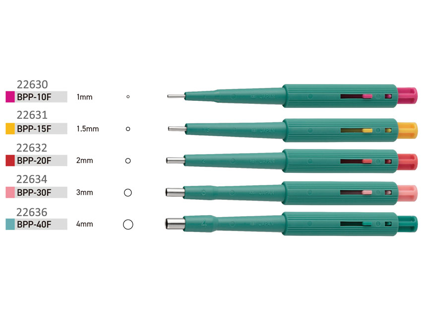 Biopsia.Perforators ar virzuli.Nerūsējošā tērauda asa griešanas mala.Rievotais rokturis drošai satvērienam.Uz katra perforatora ir iespiests izmērs, lai atvieglotu atpazīšanu.Ieteicams dermatoloģijai, ginekoloģijai, podoloģijai.Katrs perforators ir atsevišķi aizzīmogots atdalāmā veidā.Caurspīdīgs iepakojums.