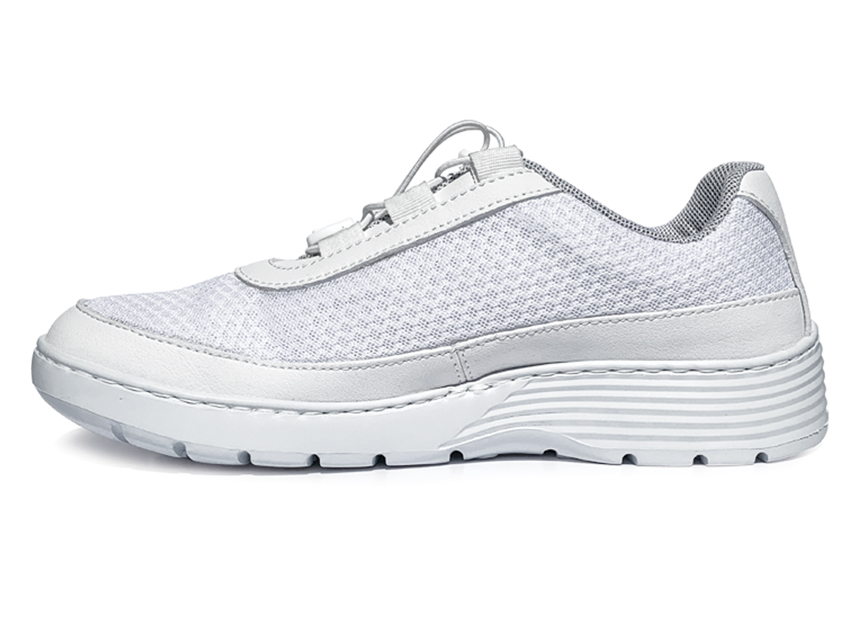 PROFESIONĀLIE SNEIKERI. HF100 profesionālie sneikeri ar elastīgām šņorēm. Krāsa: balta. Izmērs: 46. Profesionālie sneikeri no elpojoša mikrošķiedras auduma. Īpašības. Elpojošs oderējums. Ātra aizdare lielākai ērtībai. EVA LEVIREX® zole ar antistatisku ieliktni. Noņemama un antistatiska iekšzole no divblīvuma PU. Piemēroti mazgāšanai veļasmašīnā līdz 40°C. PPE kategorija II. Aizsargapavi profesionālai lietošanai saskaņā ar harmonizēto standartu EN ISO 20347:2012.