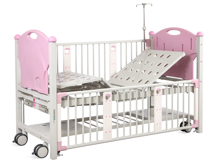 CHILDREN BED - 2 cranks - pinkBeds for children with frame made of sheet metal bending and welding.Plastic parts made of ABS material and epoxy painting.Bed ends are made of PP blow moulding to protect bed and patient.GuardrailAluminium alloy liftable guardrail with 8 cm distance among protective tubes. 3 gears to adjust height, anti-pinch hands to protect children.IV PoleStainless steel IV pole, bearing 15 kgHand controlManual cranks to control back and leg liftingsPlatformConcave vent hole design of the panel allows strong air permeability and can effectively prevent bedsoresShoes’ holderUtility and shoes holderCastors Ø 12.7 cm (5”)Castors with brakes