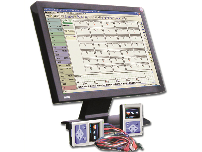 Sistēma ECG Holter. Sistēmā ietilpst ECG reģistrētājs un programmatūra, kuru var pievienot datorsistēmai vai lāzerprinterim. Iebūvēta flash-atmiņa, lai palielinātu atmiņas apjomu. Paraugu ņemšanas biežums 1000 paraugu/sekundē uzlabo signāla kvalitāti. Sistēmas precizitāte tiek nodrošināta uz AHA un MIT datu rēķina. Īpatnības: - Programmatūras interfeiss. - Ātra un precīza analīzes sistēma. - Speciāla R punkta rediģēšanas sistēma. - Pilnīga segmenta ST analīzes funkcija. - Visu kanālu Т-viļņa funkcijas analīze un trenda viļņa T-aiļu analīze. - ECG trenda grafika apskats - HR mainīguma sistēmas analīzi nodrošina ar regulāru SDNN, SDNN, RMSSD, LF, HF, laika un frekvenču domēnu. - QT analīze un trenda intervāla QT analīze. - ECG iegūst tieši bez atsevišķa kanāla- turklāt ir funkcijas VCG, VLP, TVCG, HRT, TWA. (оpcija) Reģistrētājs: - 12-kanālu sinhronā ECG. - Маzs ECG-reģistrētājs ar krāsu OLED-ekrānu ECG attēlošanai un datu apskats reālā laikā. - Ietilpība līdz 2 Gb. - Diskretizācijas biežums pēc izvēles: 200, 500, 1000 paraugi/sek. - Parauga precizitāte: 12 biti. - Iebūvēts FLASH nesējs, USB interfeiss. - Оperāciju sistēma: Windows 98, 2000, XP, 7. Теhniskie parametri: • Spriegums: 1 мВ ± 5%. • Standarta jutīgums: 10 mm/mV ± 5%. • Trokšņa līmenis: = 30μV • CMRR: =60dB • Reģistrēto frekvenču diapazons: 10Hz kā orientieris, 0.5 Hz 55 Hz- -3dB • Laika konstante:> 3.2s • Skenēšanas ātrums: 25 mm /s ± 5% • Noturīgs polarizācijas spriegums: ± 300 mV • Mazākais mērījumu signāls: 50μV р-р