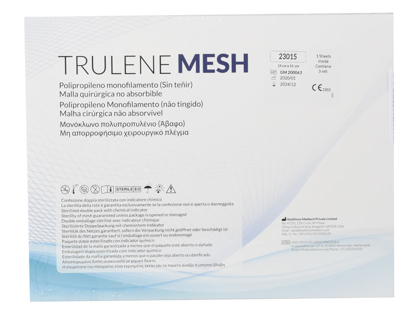 TRULENE (polipropilēna) MESH - Neabsorbējošs.Ekvivalents Ethicon zīmols: PROLENE MESH.Izmērs: 7,6 x 15 cm.Īpašības.- Nelīp pie audiem un ir bioloģiski inerts.- Nodrošina spēcīgu atbalstu uz nenoteiktu laiku.- Lieliska stiepes izturība un lokanība.- Vieglai velkšanai caur audiem.- Inerts materiāls.- Nesatur mikroorganismus.- Vismazāk trombogēns.Pielietojums.- Trūces labošana, plastiskā, vispārējā un kuņģa-zarnu trakta ķirurģija.Tehniskā informācija.- Monofilamenta polipropilēna neabsorbējošas ķirurģiskas šuves.- Produktam nav nepieciešams pārklājums, tiek pārdots neapstrādāts.- Sterilizēts ar etilēnoksīdu.Daudzvalodu rokasgrāmata un kaste: GB, FR, IT, ES, PT, DE, GR.Derīguma termiņš 5 gadi.